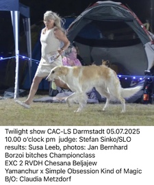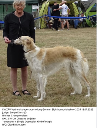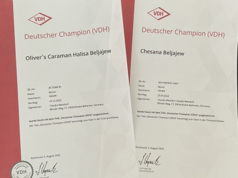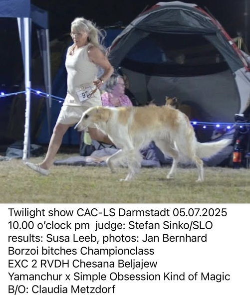 Chesana Beljajew hat die Bedingungen für den Hessen-Thüringen-Cup in der Erwachsenen-Klasse 2024 erfüllt. Bedingungen waren 5 CAC-Ausstellungen in 4 verschiedenen Vereinen. Zur Siegerehrung am 05.07.2025 sind wir in Darmstadt zur Landessiegeraussteung und Nachtshow un 21:00 vor Ort.